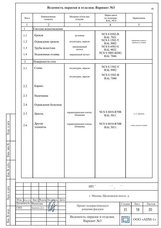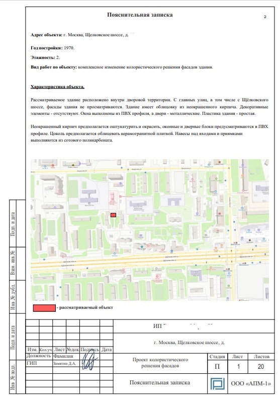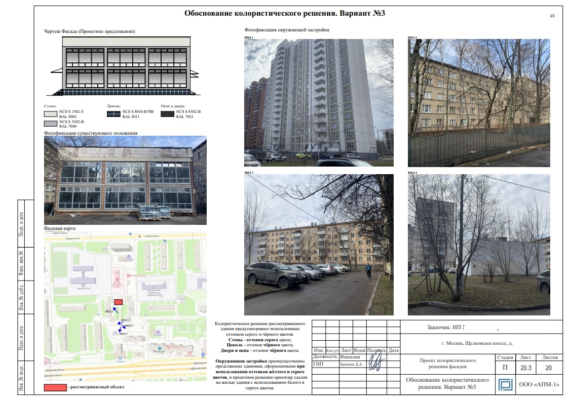 Проект колористических решений входит в перечень необходимых документов для согласования в Москомархитектуре, который готовится для объектов недвижимости. В данном случае – это нежилое помещение или здание. Проект готовился для частной охранной организации.