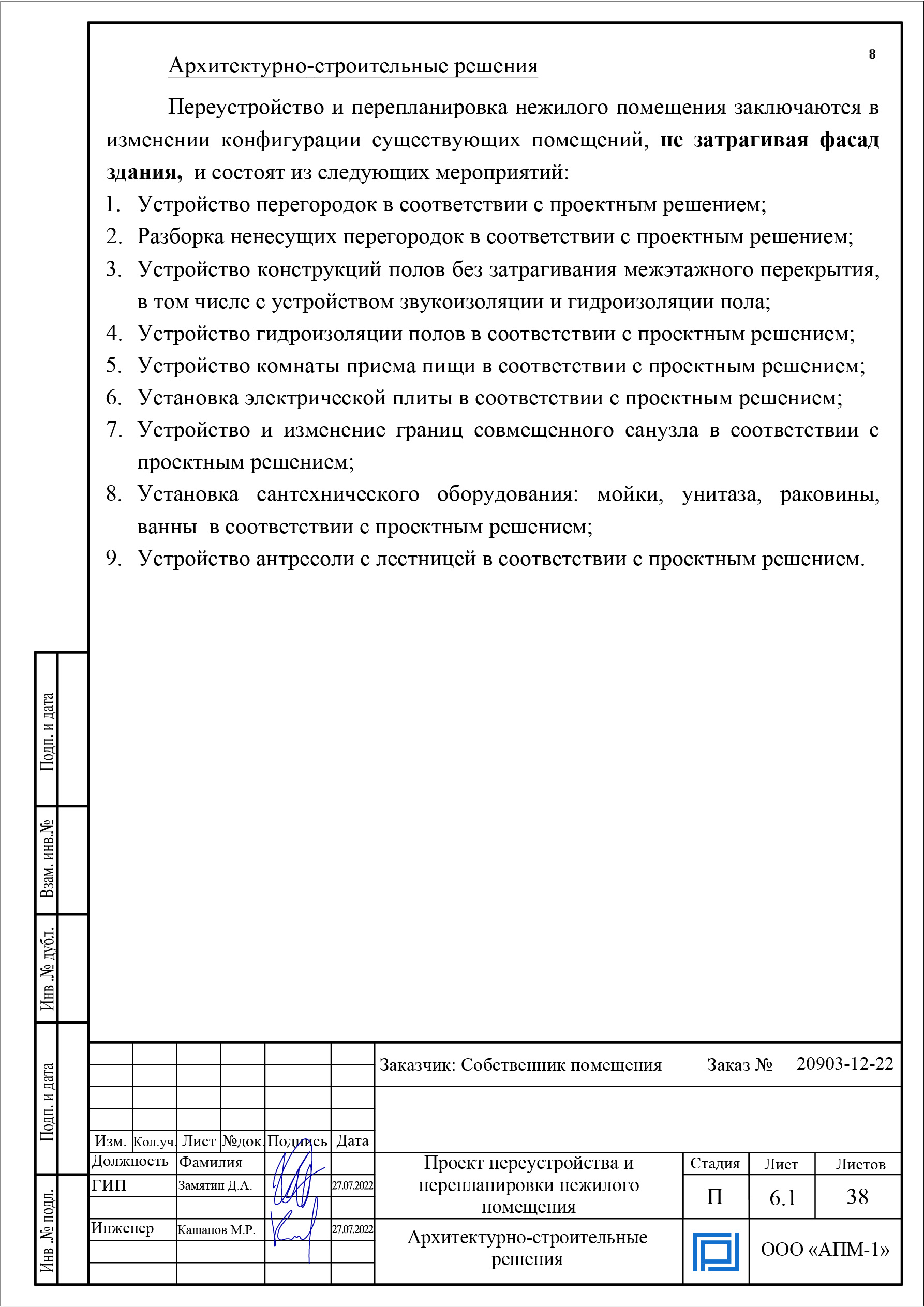 - проект перепланировки со всеми необходимыми разделами в зависимости от функционала помещения;