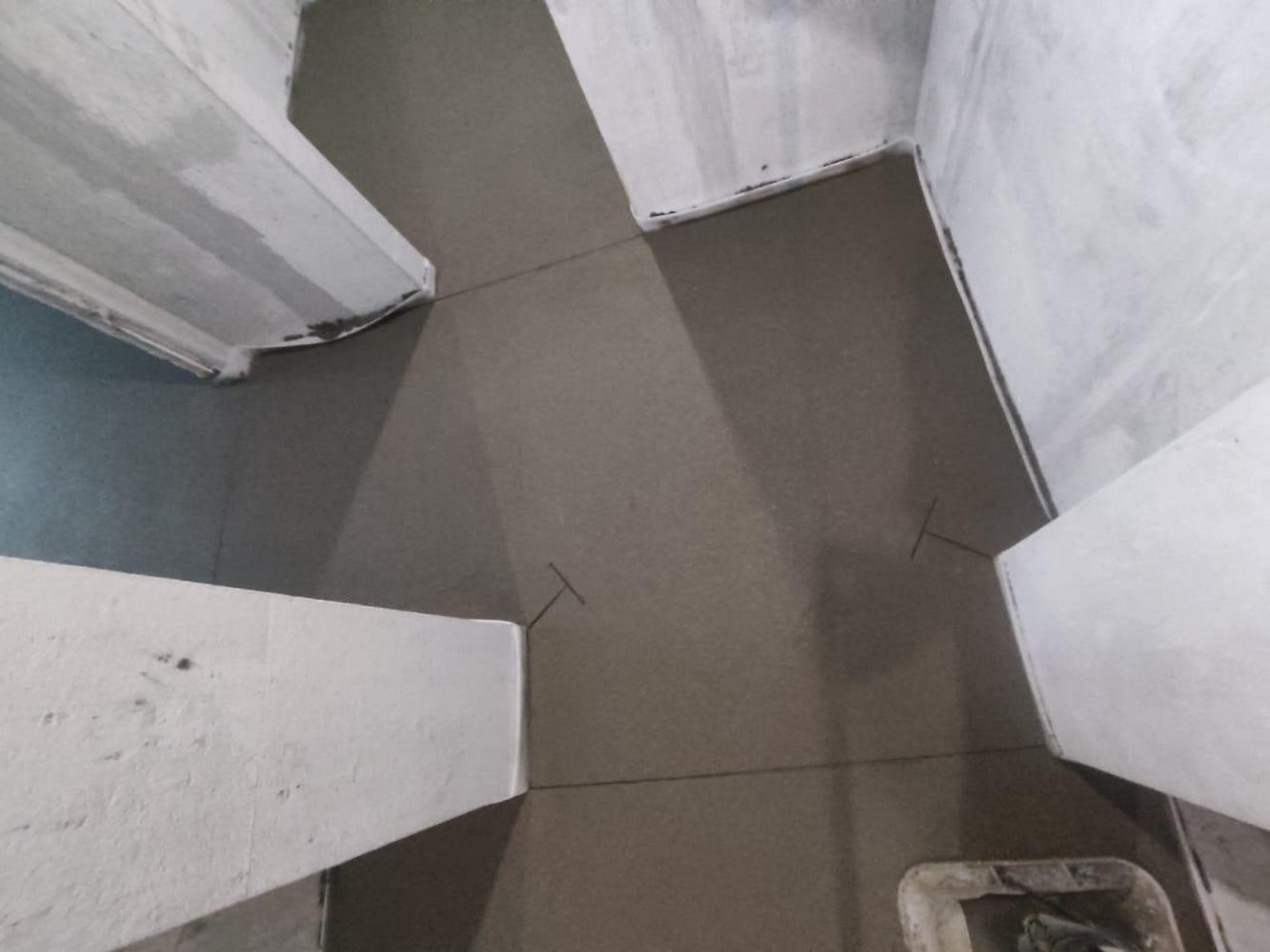 - Сделать штробы в стяжке под перегородки и монтировать их на плиту перекрытия. Под стяжкой проходят инженерные коммуникации (кабели, трубы водоснабжения и отопления), поэтому штробить нужно максимально аккуратно. Вот как это может выглядеть на объекте. Стяжка была залита застройщиком. В ней сделали штробы, выровняли основание и уложили блоки на плиту перекрытия. На фотографиях видно, что они утоплены в стяжку: