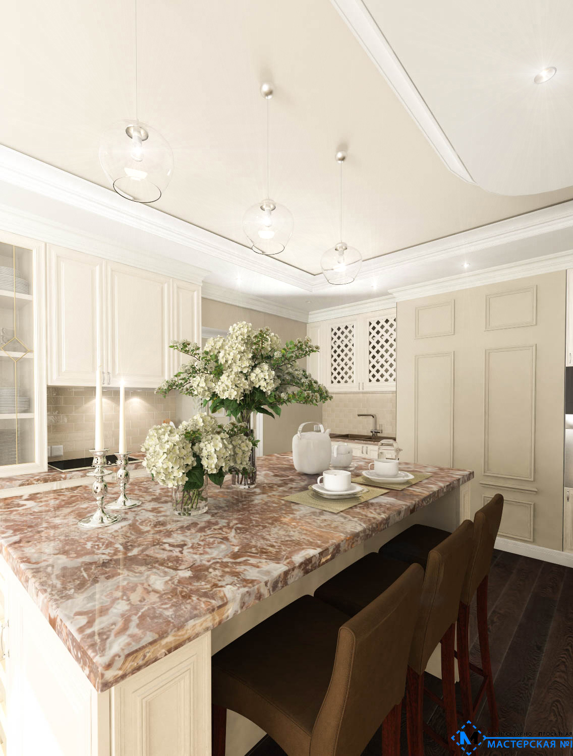 ЖК «Флотилия» – квартира в классическом стиле. Реализована идея кухни-гостиной: