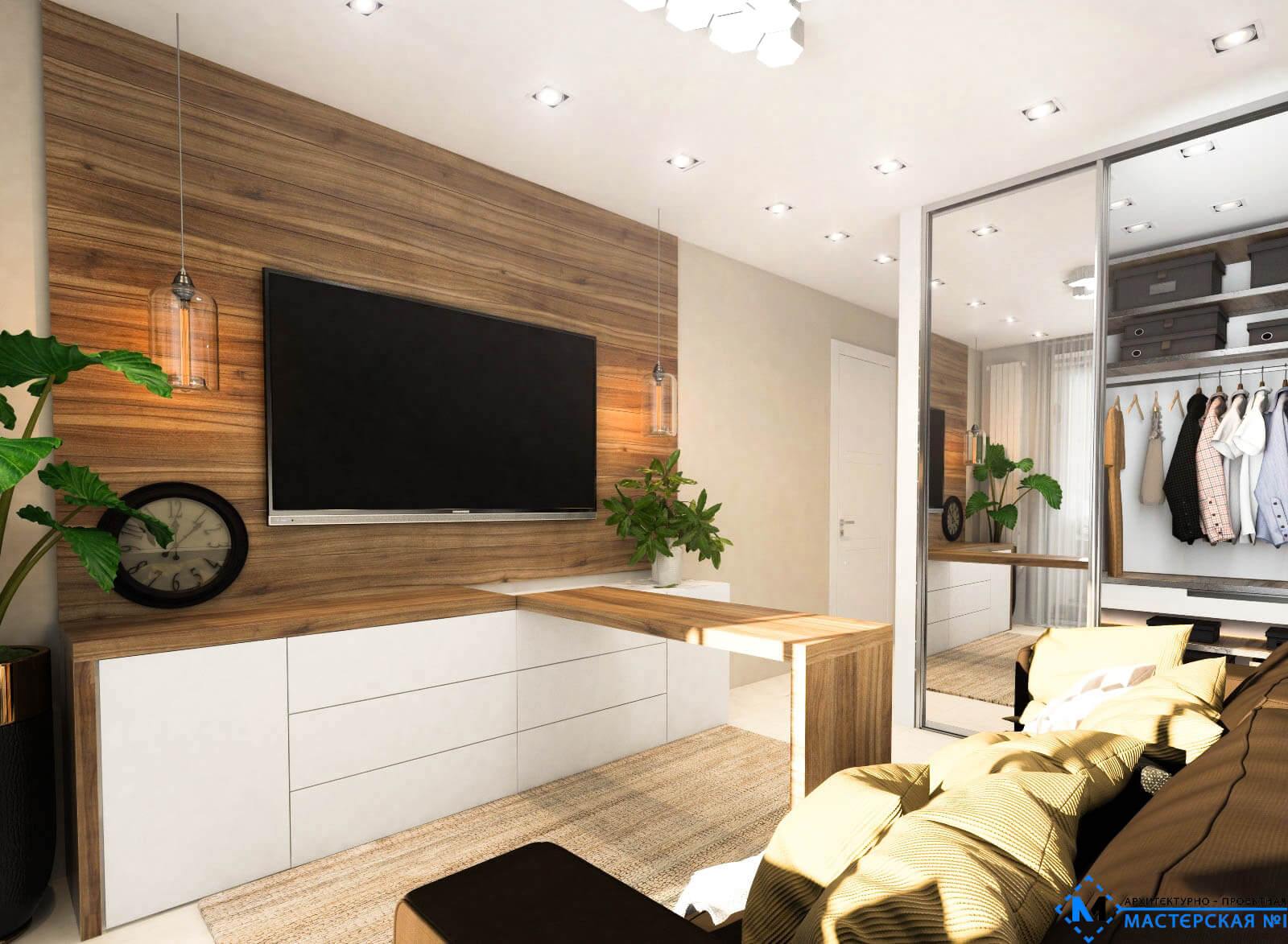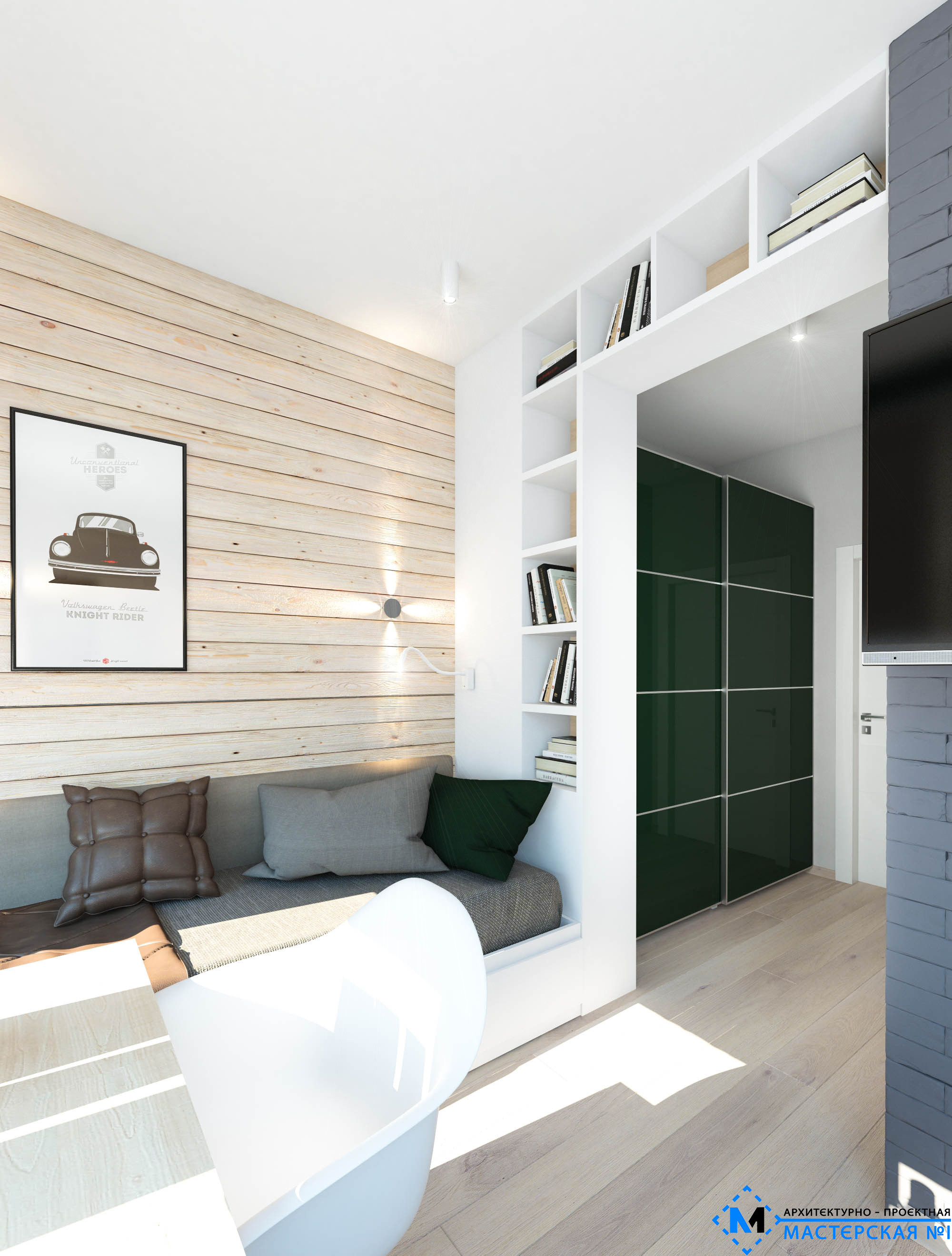 В этом проекте сделали изолированной комнату, которая до этого была проходной. Заодно оборудовали совмещенный санузел и немного перенесли дверь на кухню.