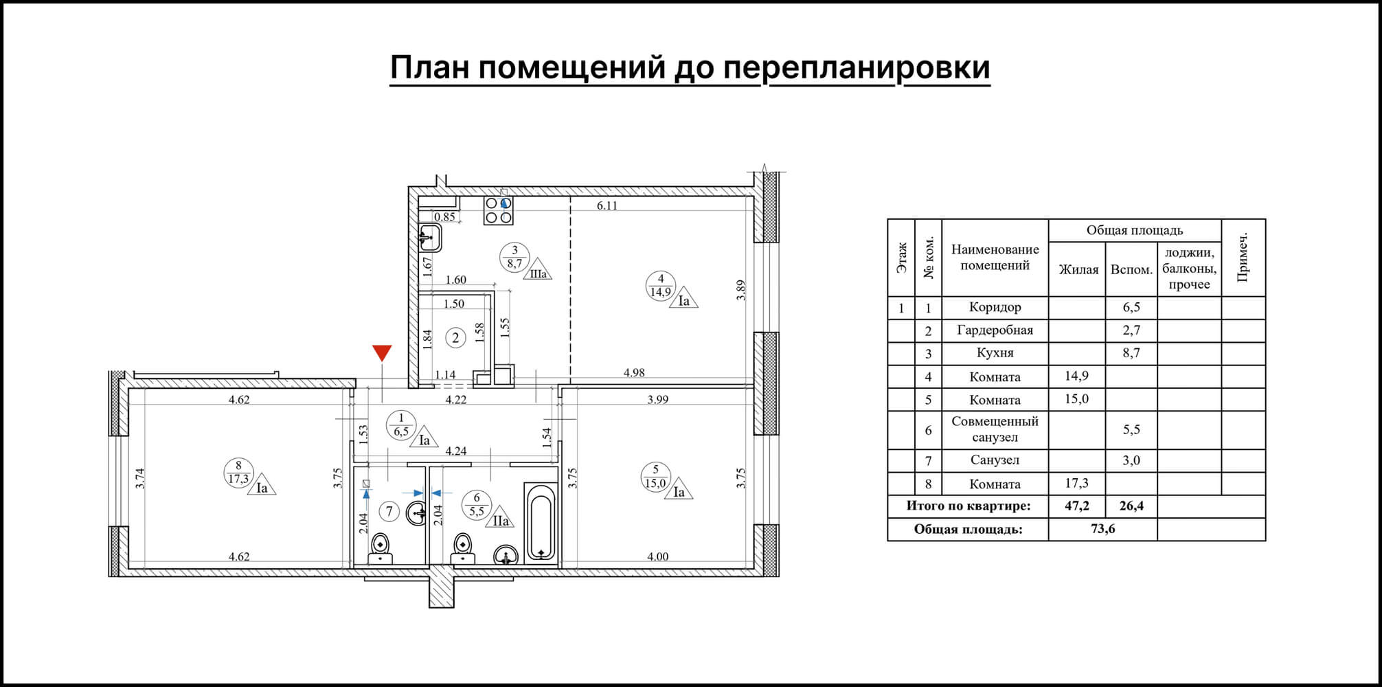 Трёхкомнатная квартира расположена на первом этаже 9-этажного дома 2024 года постройки. Общая площадь — 73,6 м². Изначальная планировка: кухня, три комнаты, два санузла, гардеробная и коридор.