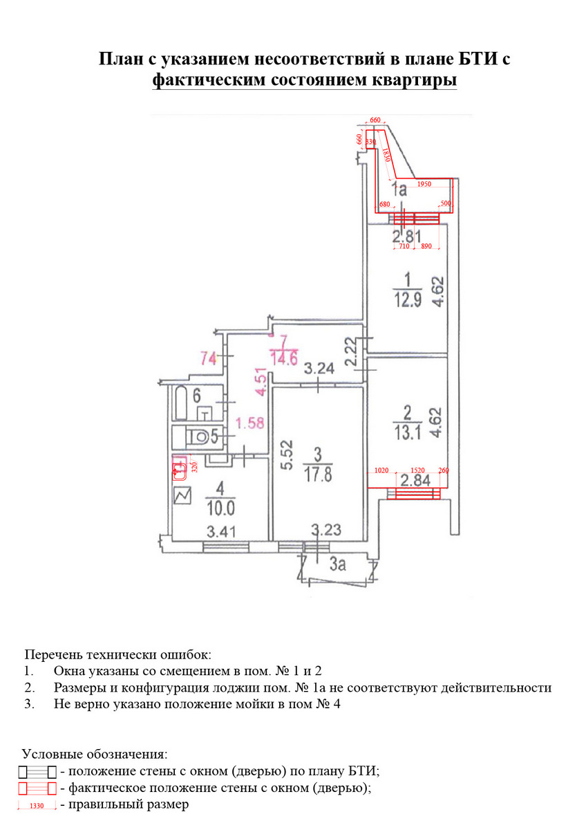 Техник подтвердит: «Да, в окнах ошиблись, только тут у вас сделана перепланировка». Под ней как раз будет подразумеваться снос шкафа либо перенос плиты, даже если она была передвинута буквально на 30 см. В итоге на плане появятся красные линии.