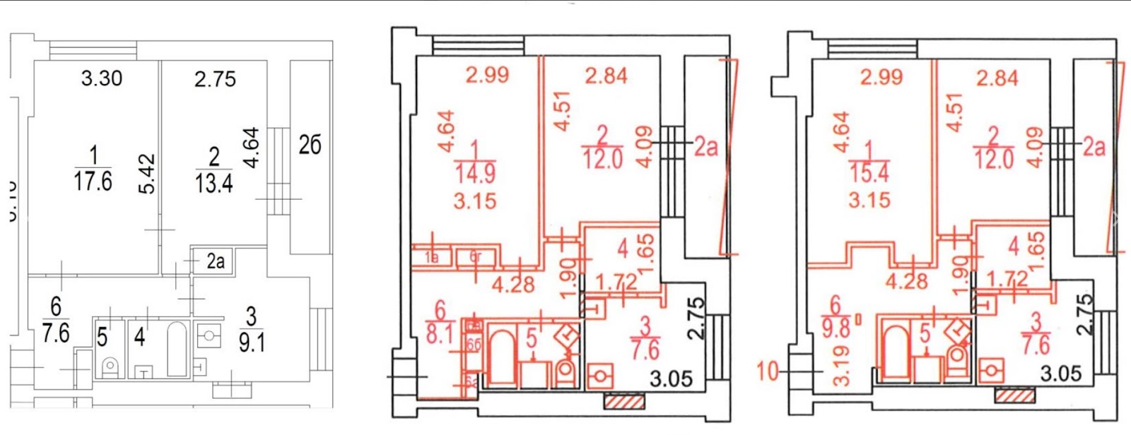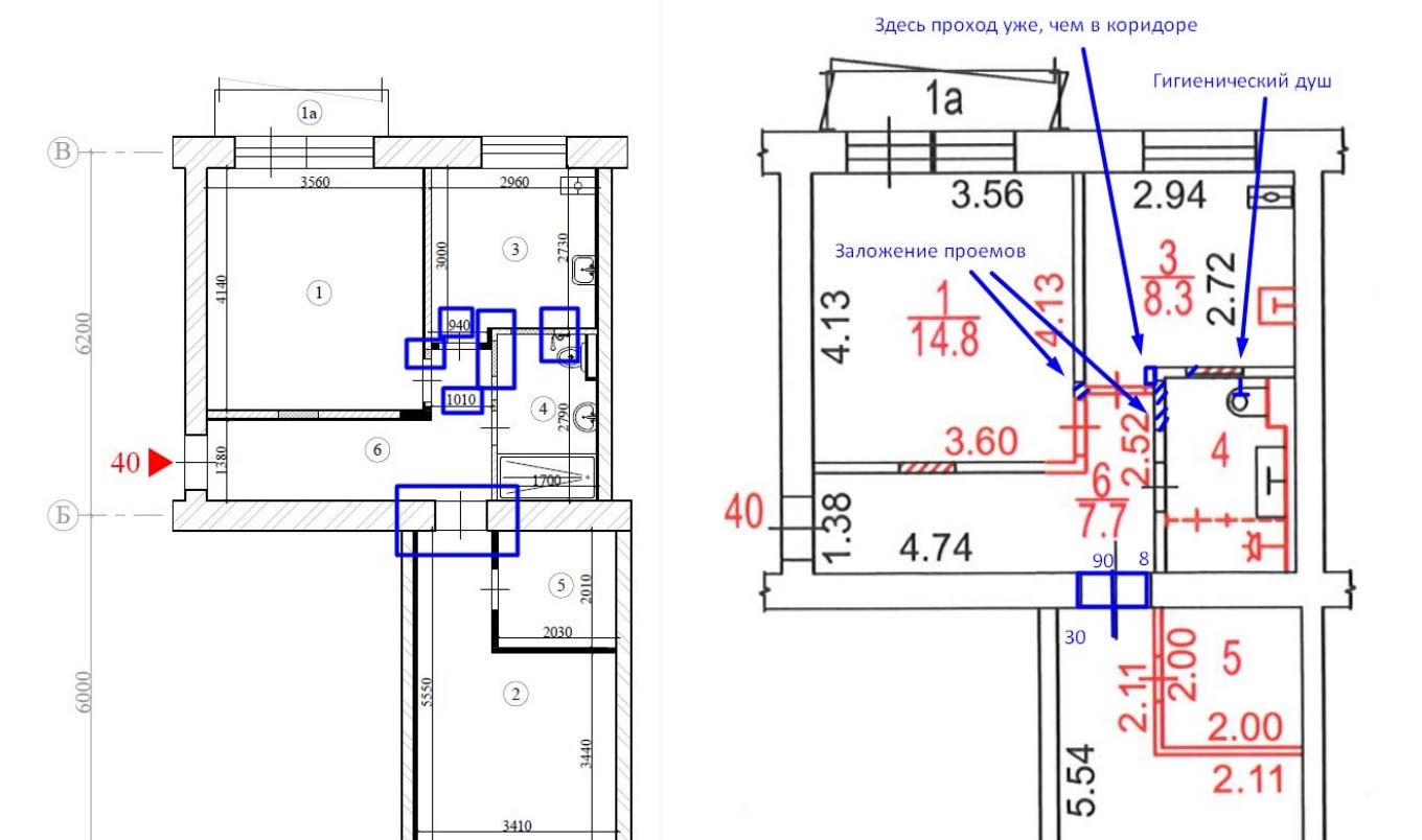На первом плане дверь и окно на лоджию перепутаны местами. После получения красных линий они исправлялись. Затем красные линии редактировались – в плане указали инсталляцию за унитазом и убрали лишние встроенные шкафы, которые ошибочно БТИ нарисовали у себя.