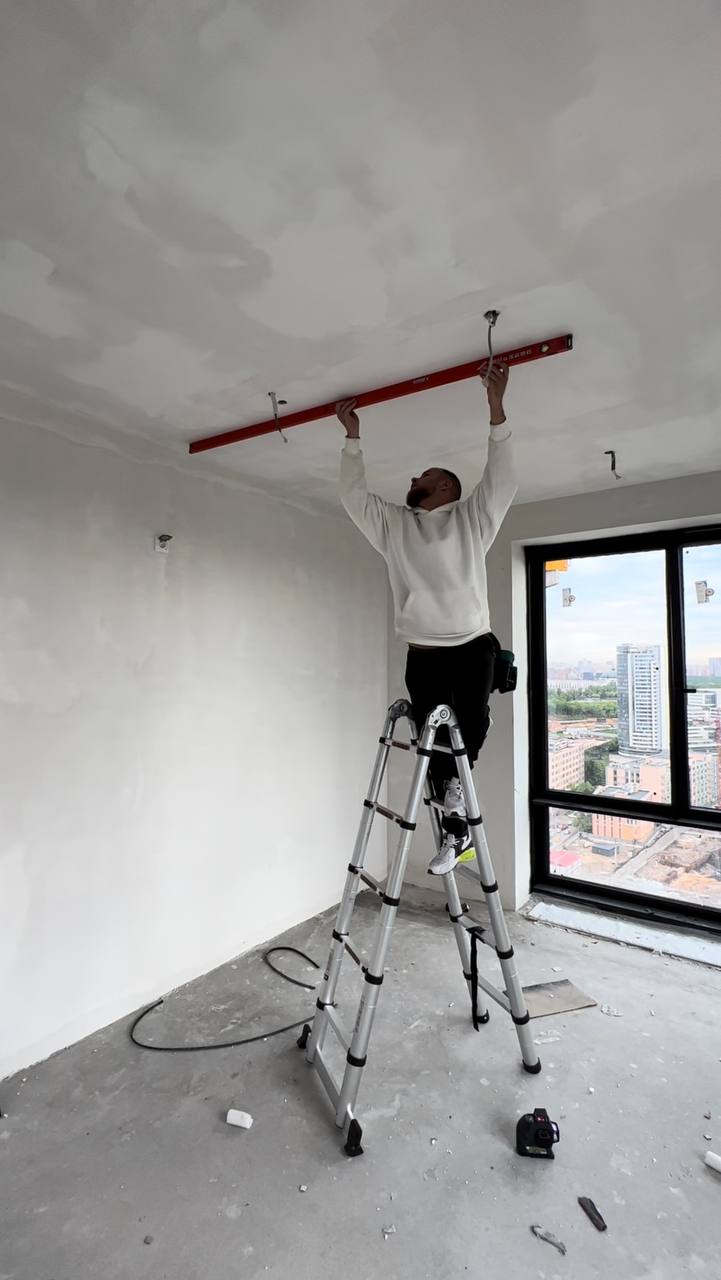 - потолок. Замеряем высоту в разных концах комнат, горизонтальность поверхности. Если отделка чистовая – проверяем целостностью покрытия, качество покраски, провисания натяжного потолка, зазоры в местах примыкания к стенам;