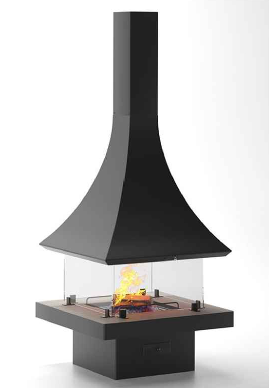 Как выглядит островной подвесной дровяной камин в квартире в новостройке: