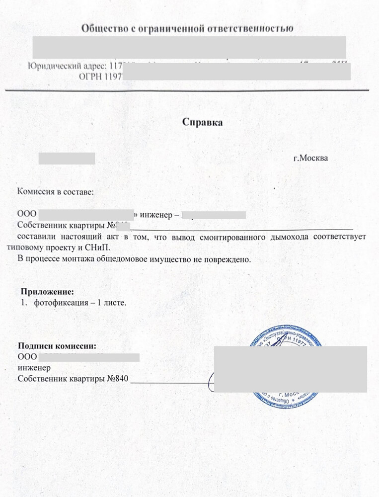 - Справка от управляющей компании о том, что монтаж топки и дымохода был выполнен без нарушений, и эту возможность изначально предусмотрел застройщик;
