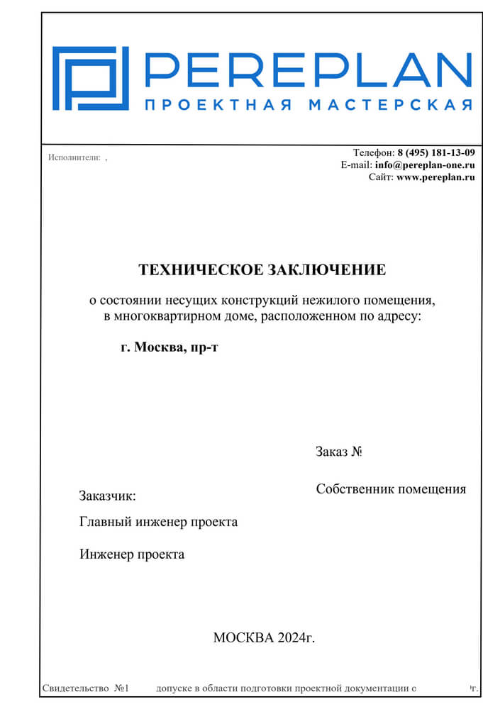Если перечисленные конструкции не затрагиваются, техническое заключение может разработать любая организация со свидетельством СРО, с допусками к обследованию конструкций и проектным работам. Например, такие допуски есть у нас в PEREPLAN, а ещё огромный опыт в разработке технических заключений. Также можем помочь с подготовкой документов для обращения к автору дома или в ГБУ «Экспертный центр».
