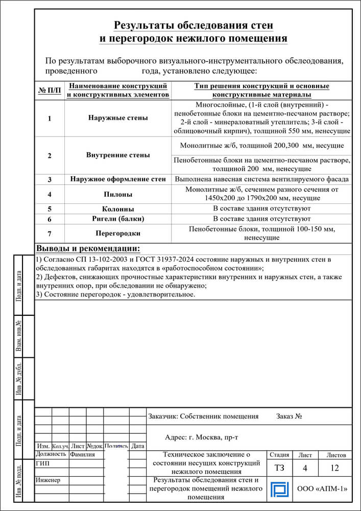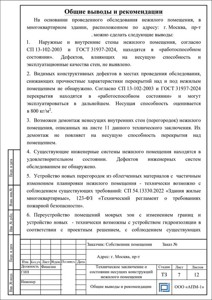 Техническое заключение — это документ, который содержит техническую информацию о помещении и результаты его обследования. Например, в каком состоянии находятся стены, перегородки, перекрытия, система вентиляции, стояки водоснабжения и отопления. Обследование позволяет понять, есть ли техническая возможность сделать перепланировку или убедиться в безопасности уже выполненных работ.