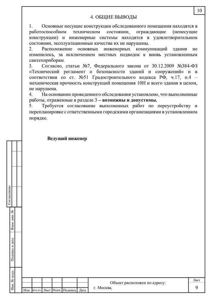 - Техническое заключение о допустимости и безопасности произведённых работ. Оно необходимо, если работы уже выполнены и требуется их узаконить. В случае, когда помещение находится в отдельно стоящем нежилом зданий, обращаться в Мосжилинспекцию не требуется. Работы нужно узаконить на основании проекта перепланировки и технического заключения в БТИ и Росреестре.