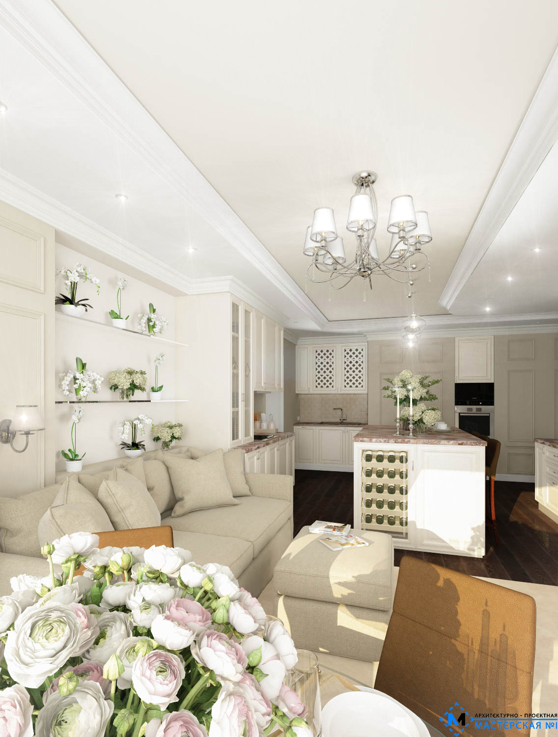 ЖК «Флотилия» – квартира в классическом стиле. Реализована идея кухни-гостиной: