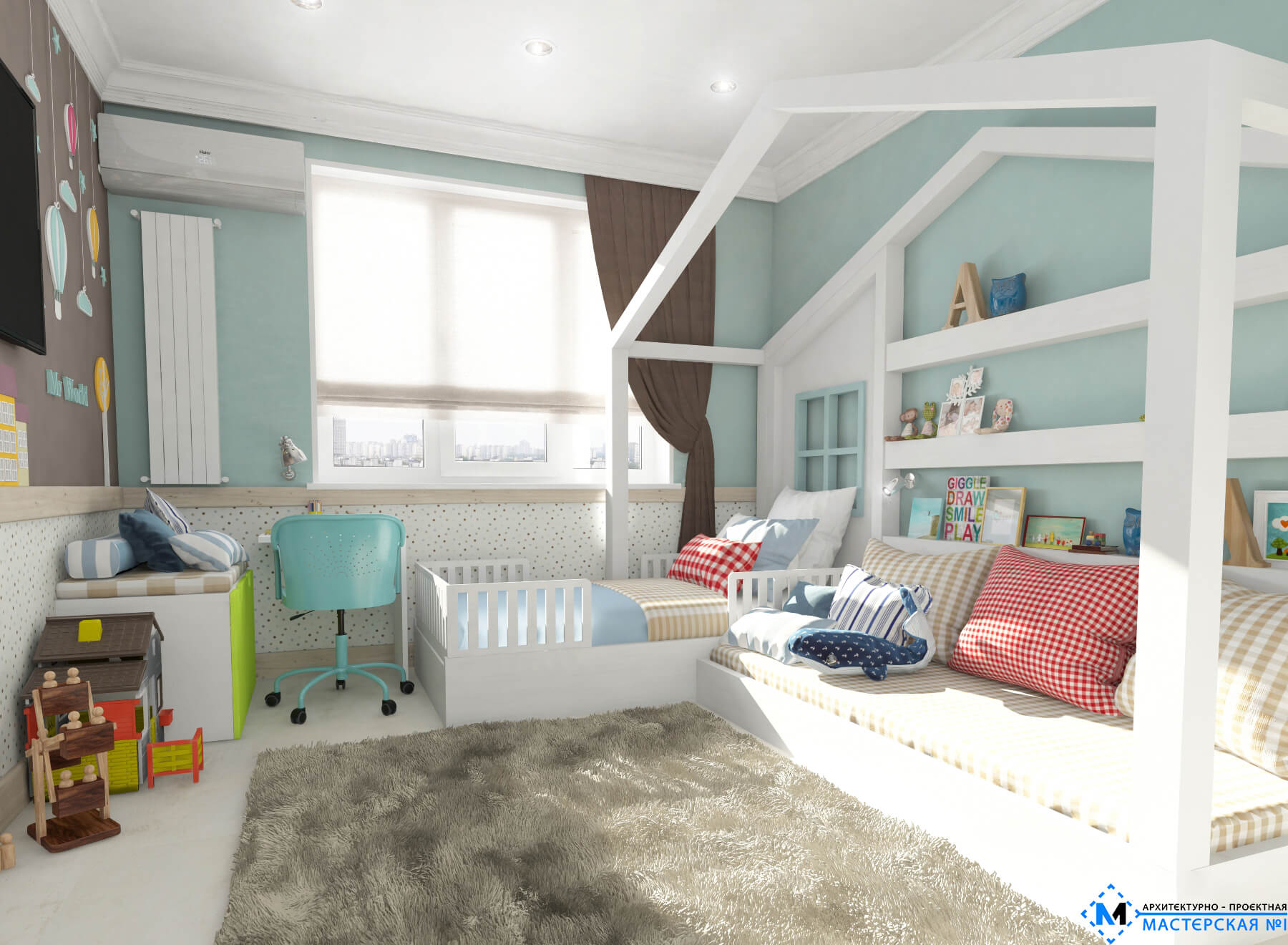 Границы комнат перенесли – так как перегородки ненесущие, стены можно спокойно двигать. Так получились гостиная (помещение №1) и три изолированных комнаты: №2, 3 и 2б – последнее помещение обозначили в проекте как «Кабинет», но находиться в нем может что угодно – спальня или детская.