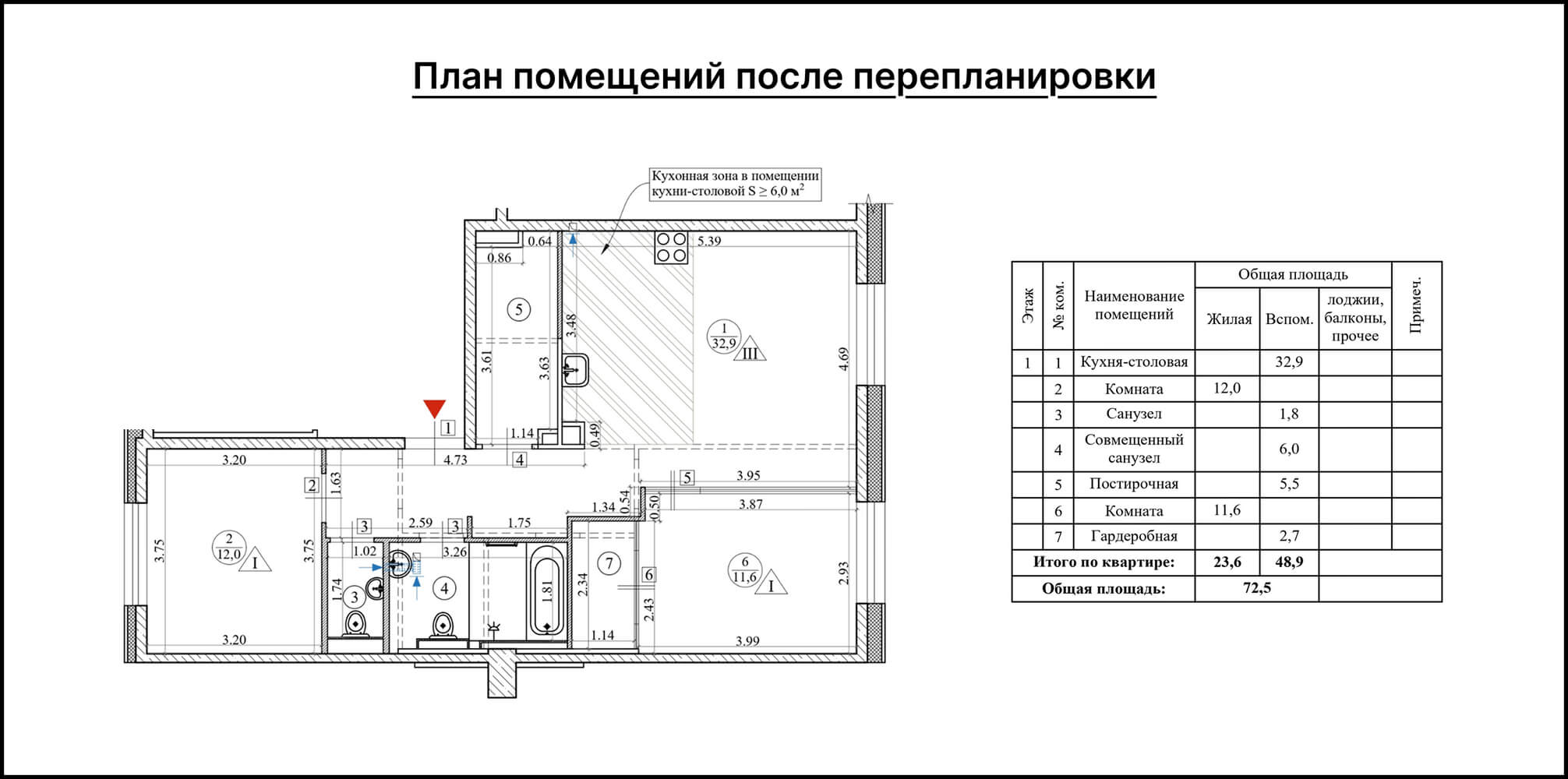 В результате изменений кухню перенесли на часть площади комнаты и организовали кухню-столовую. Также к кухне-столовой присоединили часть коридора и другой комнаты. Под квартирой нет жилых помещений, поэтому такой ремонт возможен. Освободившееся пространство на площади прежней кухни объединили с бывшей гардеробной и обустроили постирочную. Санузлы сместили в сторону одной из комнат, за счёт чего появилось пространство для новой гардеробной.