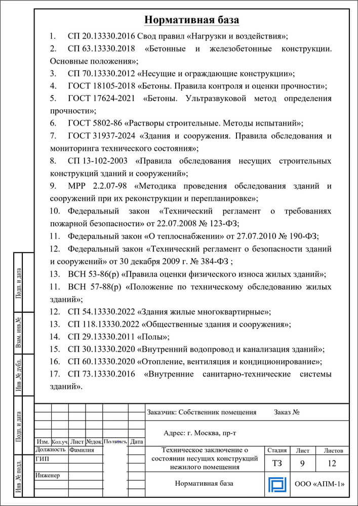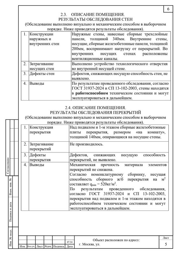 Техническое заключение — это документ, который содержит техническую информацию о помещении и результаты его обследования. Например, в каком состоянии находятся стены, перегородки, перекрытия, система вентиляции, стояки водоснабжения и отопления. Обследование позволяет понять, есть ли техническая возможность сделать перепланировку или убедиться в безопасности уже выполненных работ.
