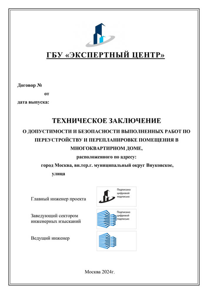 Техническое заключение — один из необходимых документов для согласования перепланировки. Оно нужно, чтобы подтвердить безопасность работ по проекту или уже выполненного ремонта. Например, не представляет ли угрозы создание проёма в несущей стене, увеличение нагрузки на перекрытие, перенос инженерных коммуникаций и т.д.